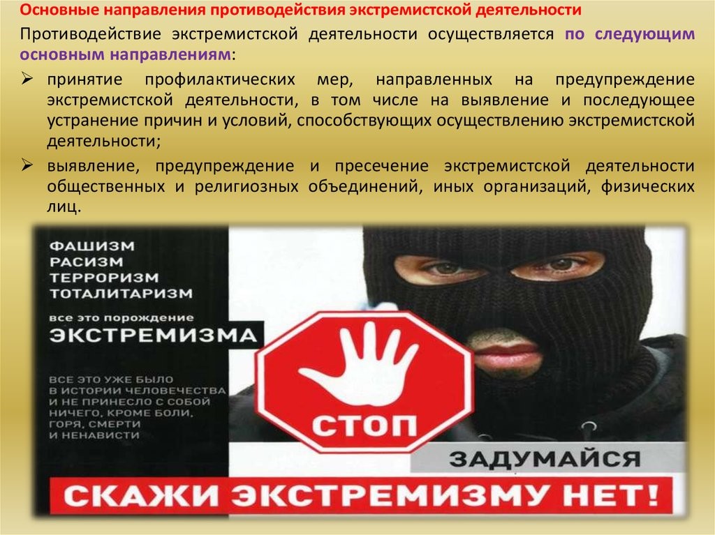 Экстремизм - приверженность отдельных лиц, групп, организаций к крайним, радикальным взглядом, позициям и мерам в общественной деятельности.